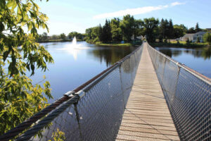 In 1902, the Canadian Pacific Railway dammed Adair Creek to create a water supply for its operations (i.e. steam locomotives), and the area became ideal for settlers. The dam soon became known as Fairly Lake and in 1905, the first swinging bridge was built across it at a cost of $300. The bridge was blown down in 1954, but it was rebuilt in 1964. That bridge was blown down again in 1991, and in 2004 the 100 metre bridge was rebuilt at a cost of $250,000. It is still standing today and is crossed over 50,000 times each year.
